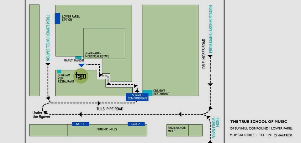 If you are coming by car, we are located inside Sun Mill Compound, near the back exit. For vehicles, the entrance to Sun Mill Compound is directly opposite the Palladium gate, just next to the Manyavar showroom. Once inside Sun Mill Compound, please follow the True School of Music (TSM) direction signs.